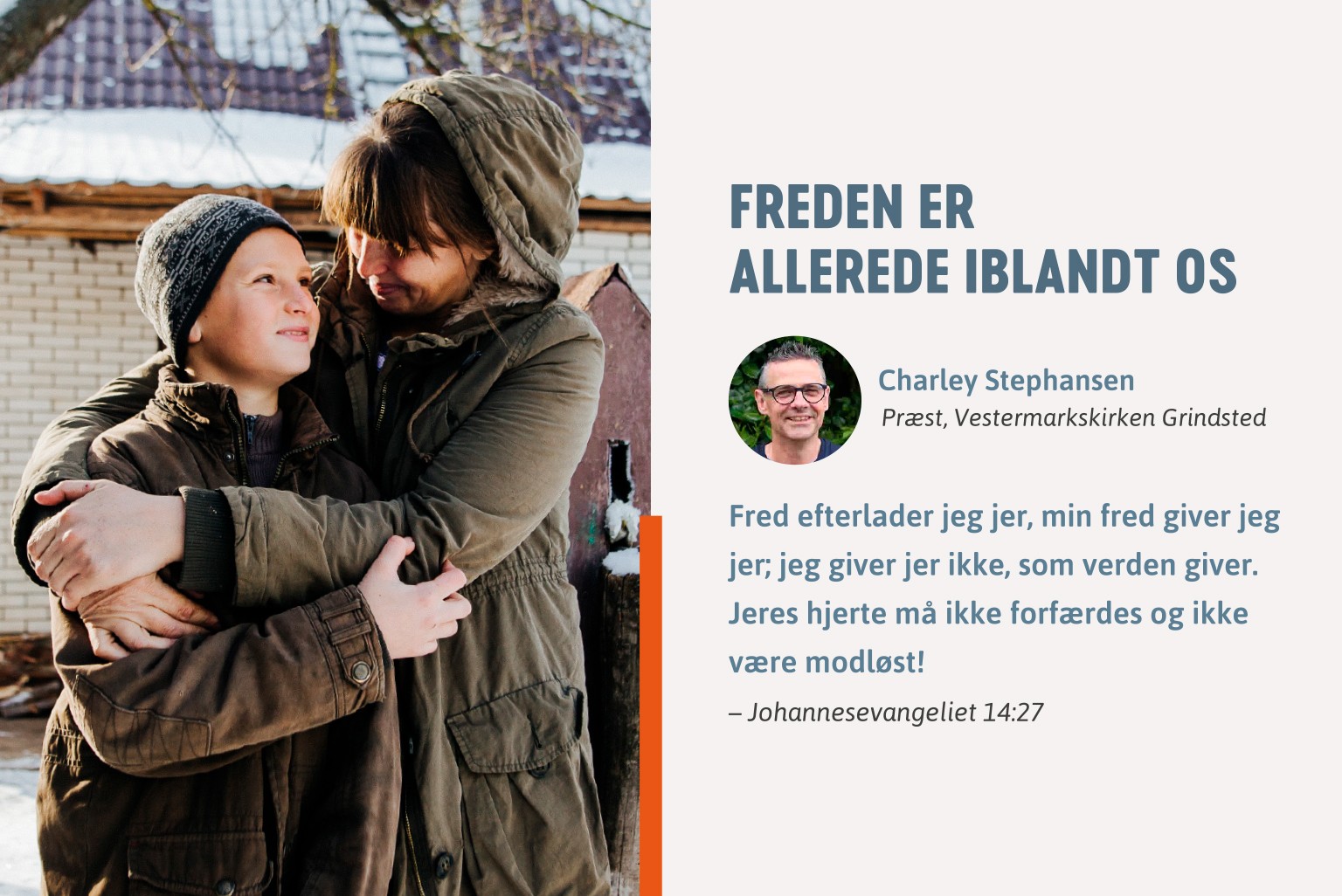 Fred efterlader jeg jer, min fred giver jeg jer; jeg giver jer ikke, som verden giver. Jeres hjerte må ikke forfærdes og ikke være modløst! - Johannesevangeliet 14:27